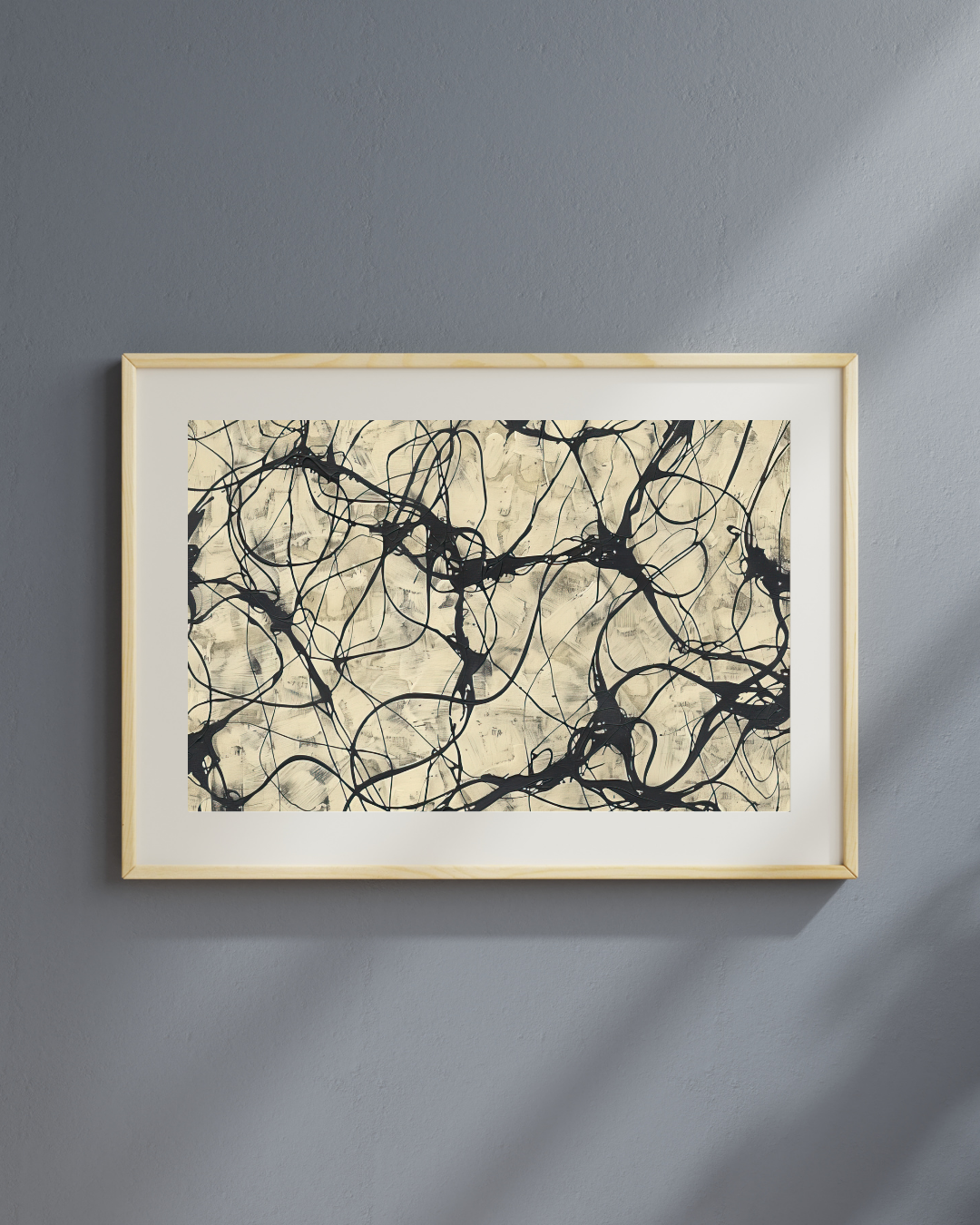 Un tableau abstrait intrigant, où des lignes noires se croisent et se mélangent sur un fond texturé beige, évoquant la complexité et l’interconnexion.
