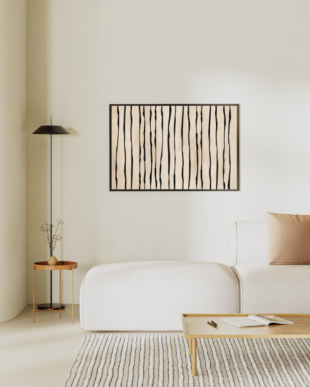 Un tableau minimaliste aux lignes verticales noires ondulantes sur fond beige, apportant une touche de sophistication et de calme à tout intérieur.