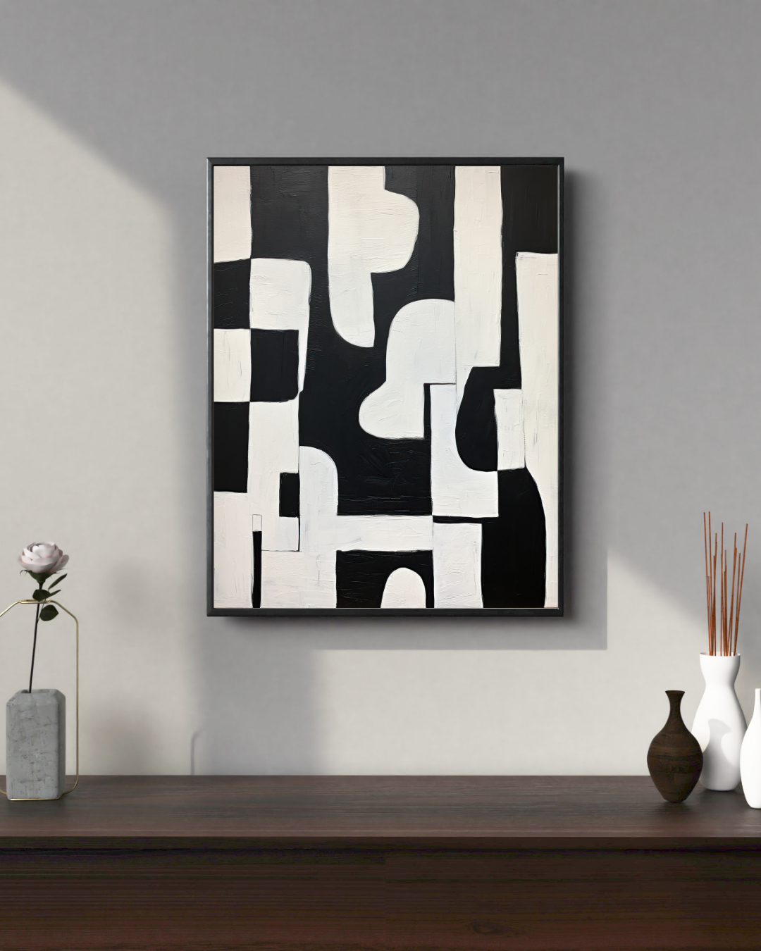 Tableau abstrait noir et blanc, jouant avec les formes géométriques et les contrastes. Une œuvre moderne et élégante qui s’intègre parfaitement dans un intérieur contemporain.