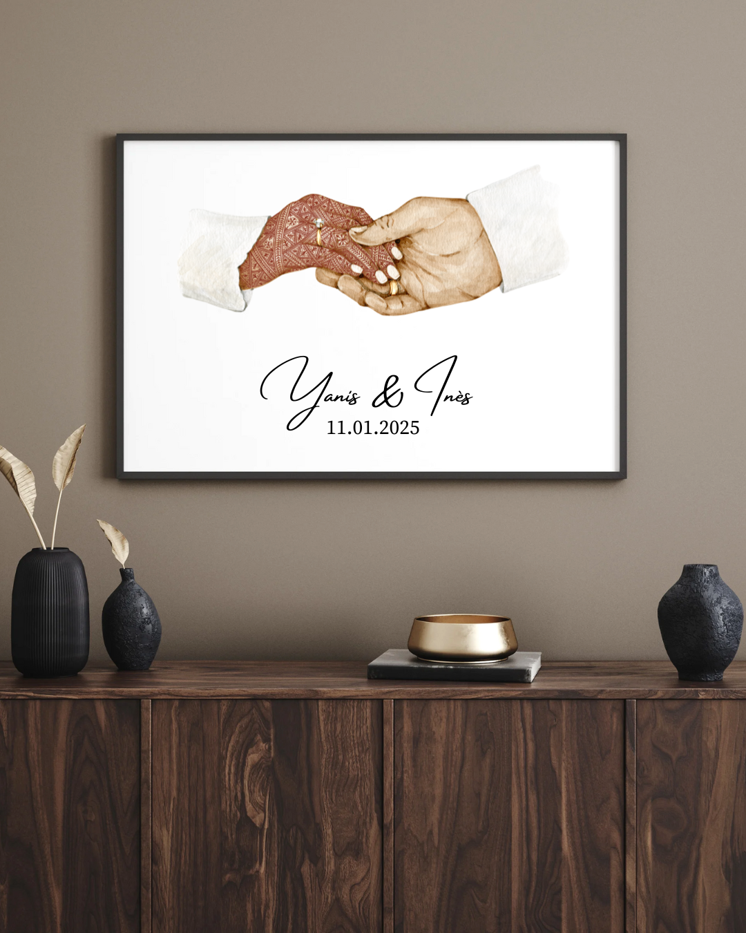 Affiche et toile personnalisée de mariage avec illustration de mains entrelacées, parfaite pour célébrer un couple unique. Idéal pour offrir ou décorer votre intérieur avec une touche intime et élégante. Inclut les noms du couple et la date de l’événement.